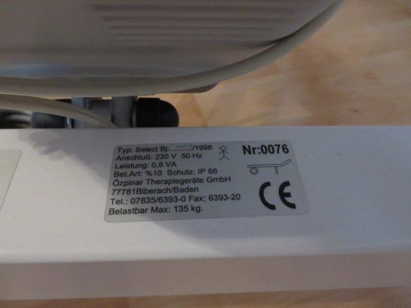Biete eine wenig benutzte Massage- und Behandlungsliege Hersteller Özpinar Typ Select mit elektrischer Höhenverstellung, verstellbarem Kopfteil und verstellbaren Armauflagen an. Liegefläche 195cm x 80cm.