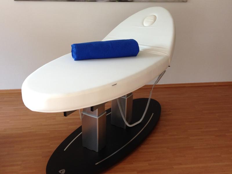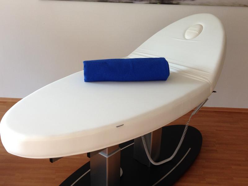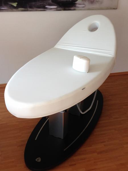 Wunderschöne Wellness- Massageliege in Ellipsen- Form. Ausgestattet mit Nasenschlitz, Verschlusskissen und positiv einstellbarem Rückenteil.