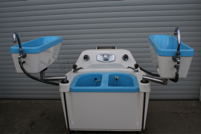 Das Vierzellenbad ist in Kompaktbauweise, in einem verzinkten Stahlrahmen gelagert, bestehend aus Pult, je 2 Arm- und Fußbadewannen, aus glasfaserverstärktem Polyester, absolut säure- und hitzebeständig, Die Armwannen sind auf kunststoffbeschichteten Schwenkkonsolen befestigt.